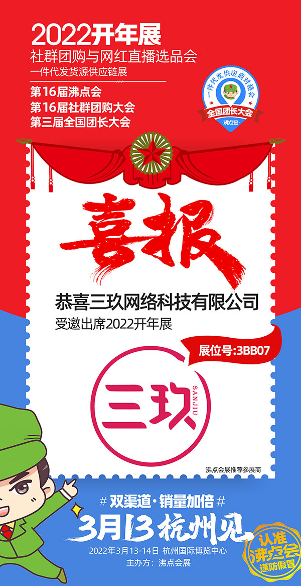 沸點(diǎn)會(huì)展主辦的2022開年展暨第16屆社群團(tuán)購大會(huì)定于2022年3月13-14號(hào)在杭州國(guó)際博覽中心舉辦,目前正在進(jìn)行展位招募,參展商和平臺(tái)方都在踴躍報(bào)名中,三玖網(wǎng)絡(luò)科技有限公司受邀參展本次展會(huì)。