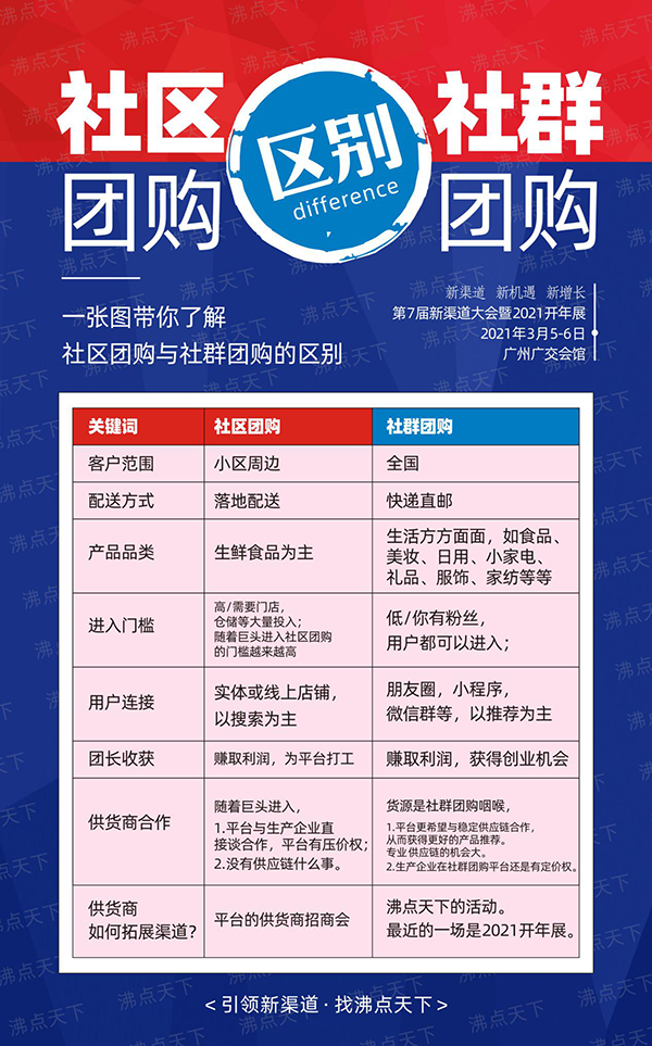 團購這個賽道2020隨著巨頭的進入被越來越多人看到。沸點天下作為社群團購大會的創(chuàng)辦者,已經(jīng)成功舉辦了12屆社群團購大會,在行業(yè)中頗有知名度,常常被問到社區(qū)團購和社群團購有什么區(qū)別?所以今天抽時間跟大家好好說說二者之間的區(qū)別,你可以根據(jù)資源不同,以及理念不同,去選擇進哪個賽道,拓展哪個渠道。