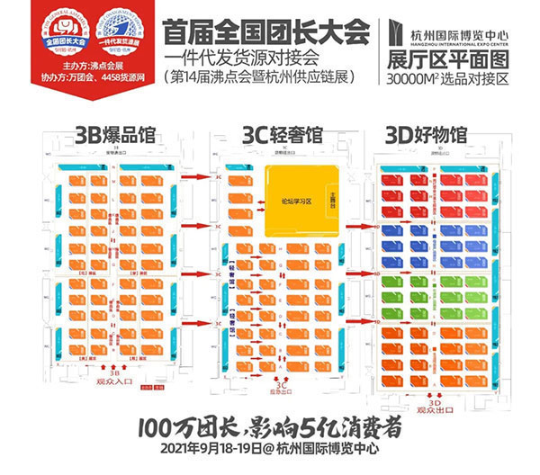 首屆全國團長大會9月18號在杭州國際博覽中心舉辦,有3個展館,30000平展覽面積,分別是爆品館、輕奢館、好物館,是行業(yè)規(guī)模最大影響力最大的活動。