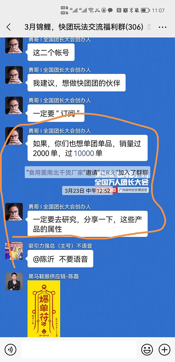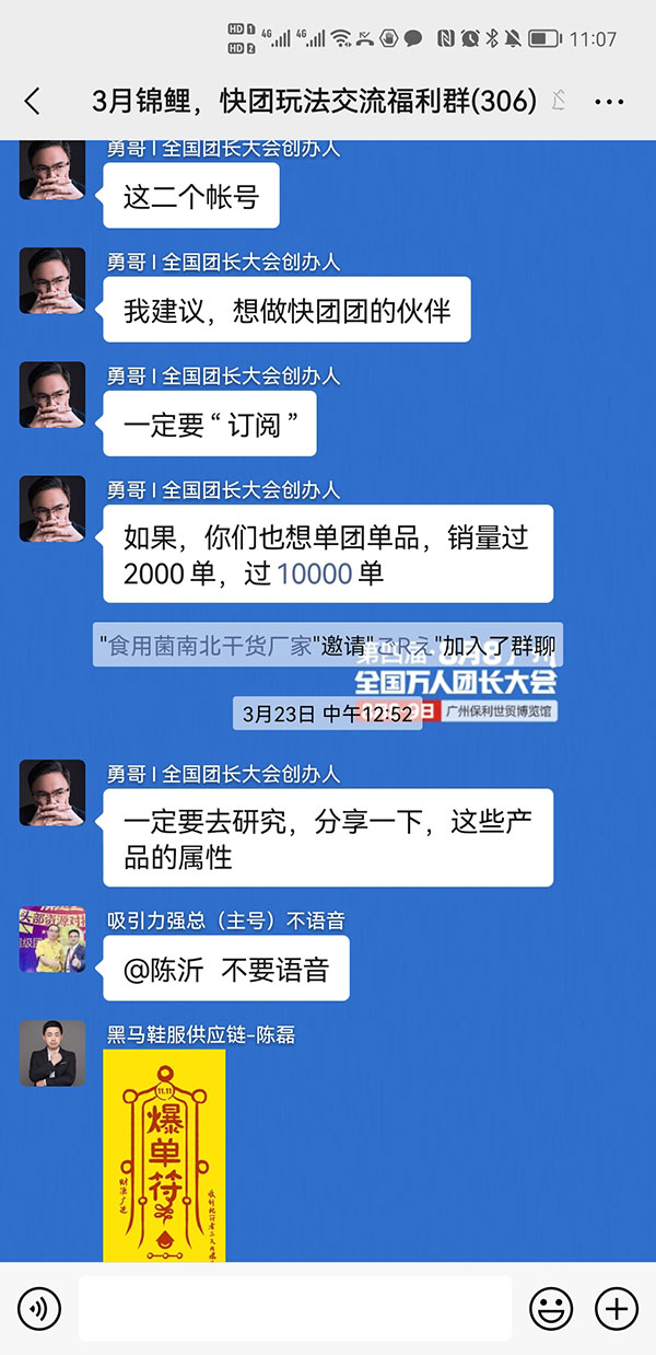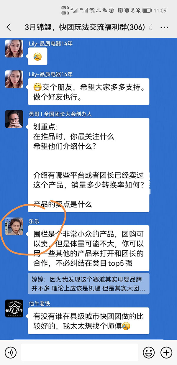 比如,今天群里討論的題目是:我想成為快團(tuán)團(tuán)幫賣,但是大團(tuán)長都要求群成員超過300或500,我該怎么辦?