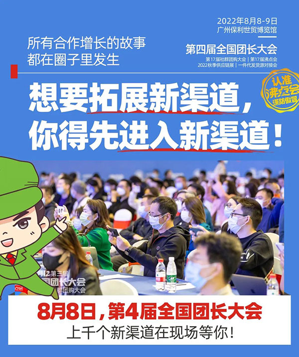 2022年8月8號,第4屆全國團(tuán)長大會暨第17屆社群團(tuán)購大會將在廣州保利世貿(mào)展覽館舉辦,上千個新興渠道方會來現(xiàn)場選品,想要拓展新興渠道的企業(yè)一定要來。