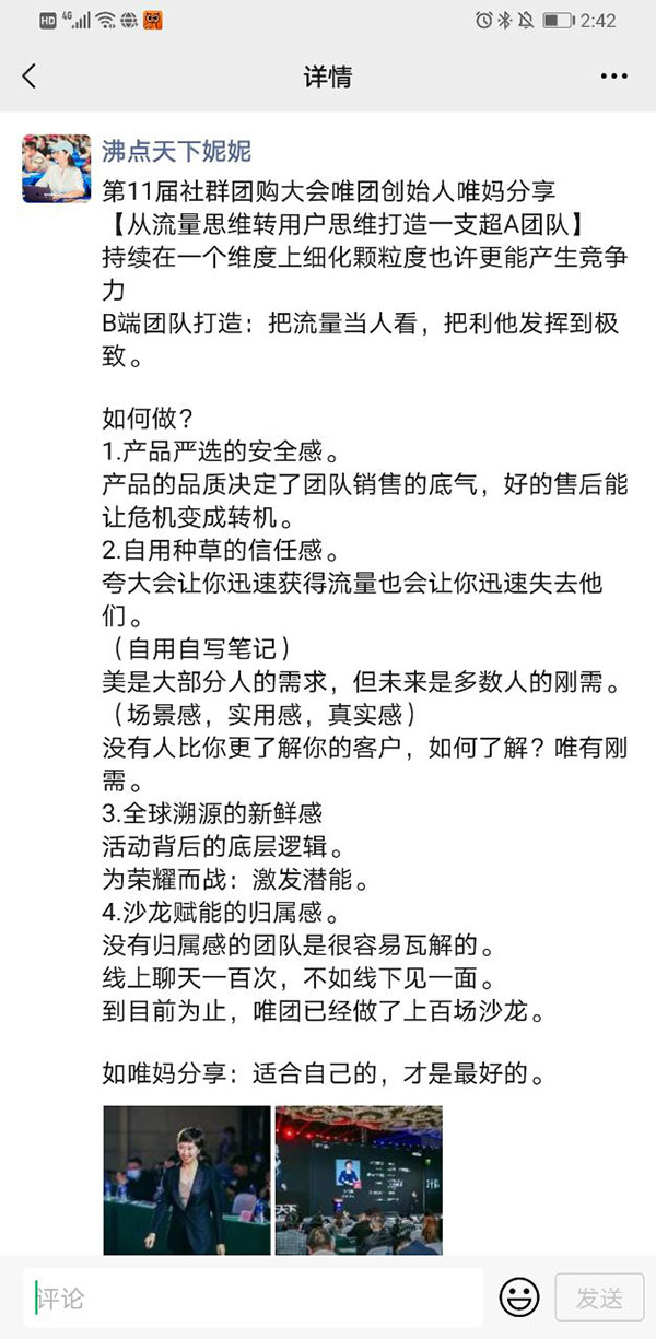 11月25號,唯團(tuán)創(chuàng)始人唯媽參加了沸點(diǎn)天下在深圳舉辦的第11屆社群團(tuán)購大會,現(xiàn)場分享【從流量思維轉(zhuǎn)用戶思維打造一支超A團(tuán)隊(duì)】。