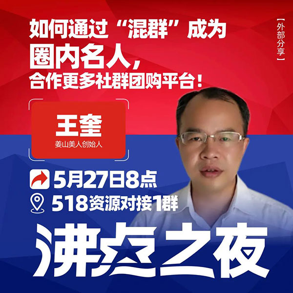 2021年5月27日晚上8點(diǎn),沸點(diǎn)之夜分享嘉賓姜山美人創(chuàng)始人王奎,他以“如何通過(guò)混群,成為圈內(nèi)名人,合作更多社群團(tuán)購(gòu)平臺(tái)!”這一主題內(nèi)容,為大家?guī)?lái)了精彩的分享。