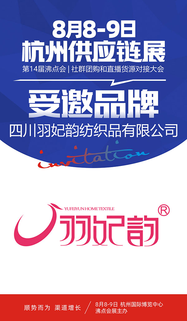 2021年8月8日在杭州,首屆杭州一件代發(fā)貨源展將在杭州國際博覽中心3樓舉辦。將匯集全國優(yōu)秀的具備一件代發(fā)貨源的供應(yīng)商集中展示,供各大平臺和團(tuán)長選品對接。優(yōu)質(zhì)家紡類品牌——羽妃韻受邀參加8月8杭州一件代發(fā)貨源展!