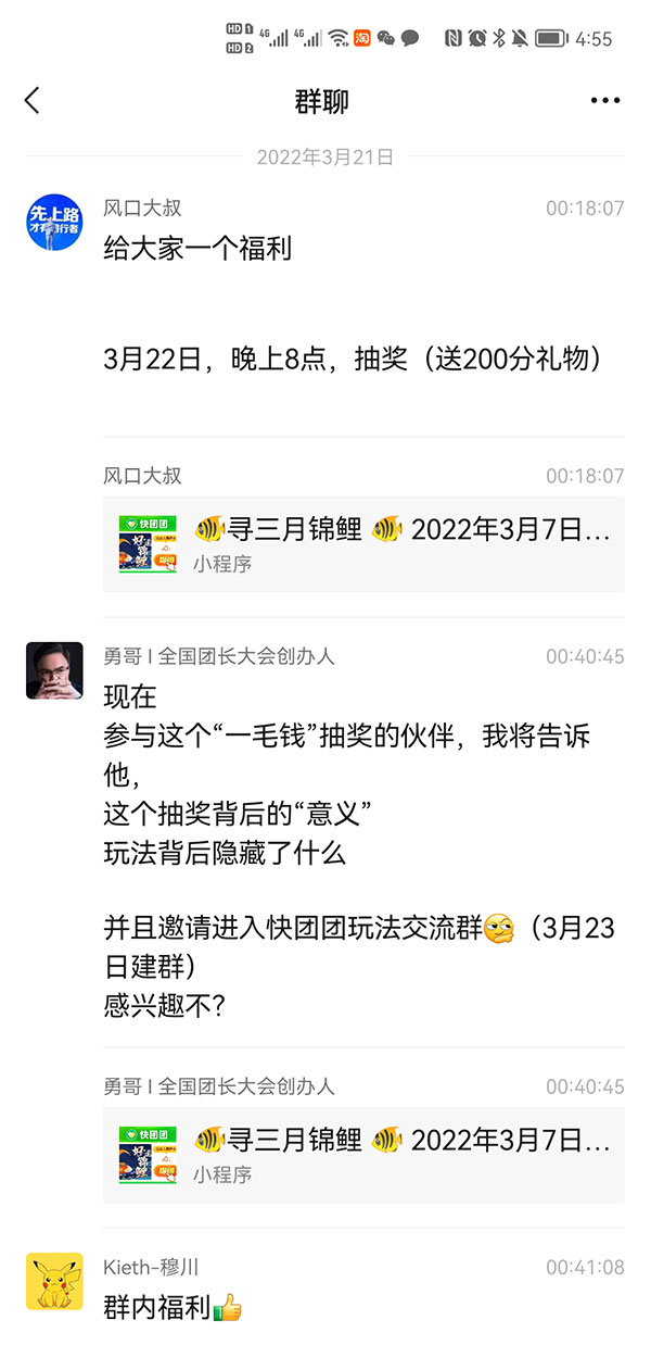 沸點天下董事長勇哥是對趨勢判斷,社群運營,營銷等都非常有實戰(zhàn)經驗的人??靾F團剛剛起來時,他就關注,目前快團團粉絲已經有了超9000+人,他坦言其中3000人是最近3天他通過“3月錦鯉活動”吸引到的。