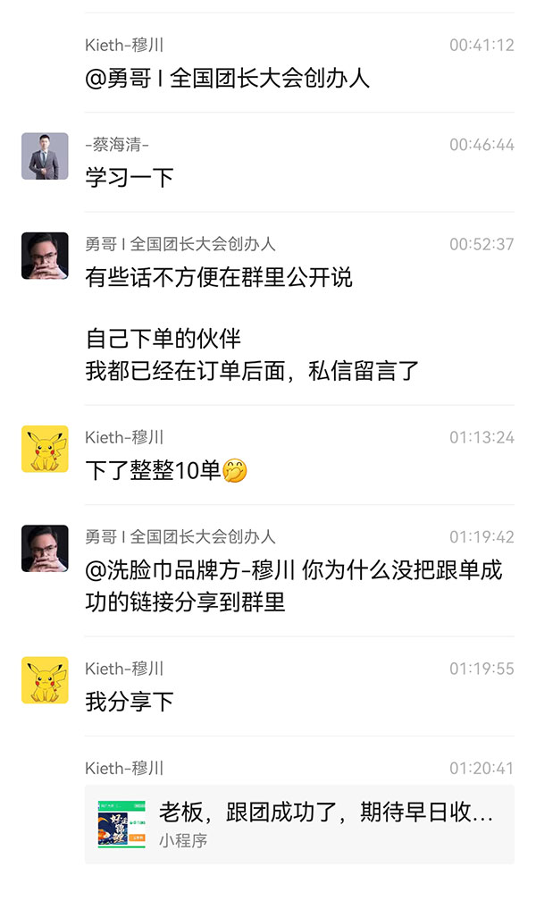 還有,下面這段話:“有些話不方便在群里公開說,自己下單的伙伴,我都已經在訂單后面,私信留言了,你為什么沒把跟單成功的鏈接分享到群里”